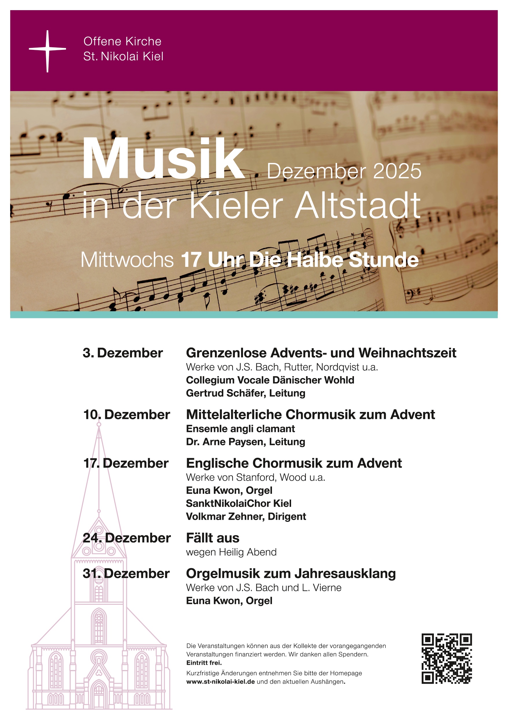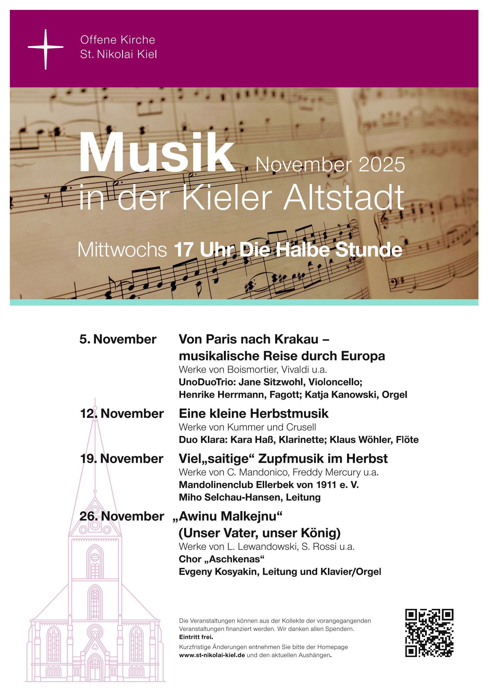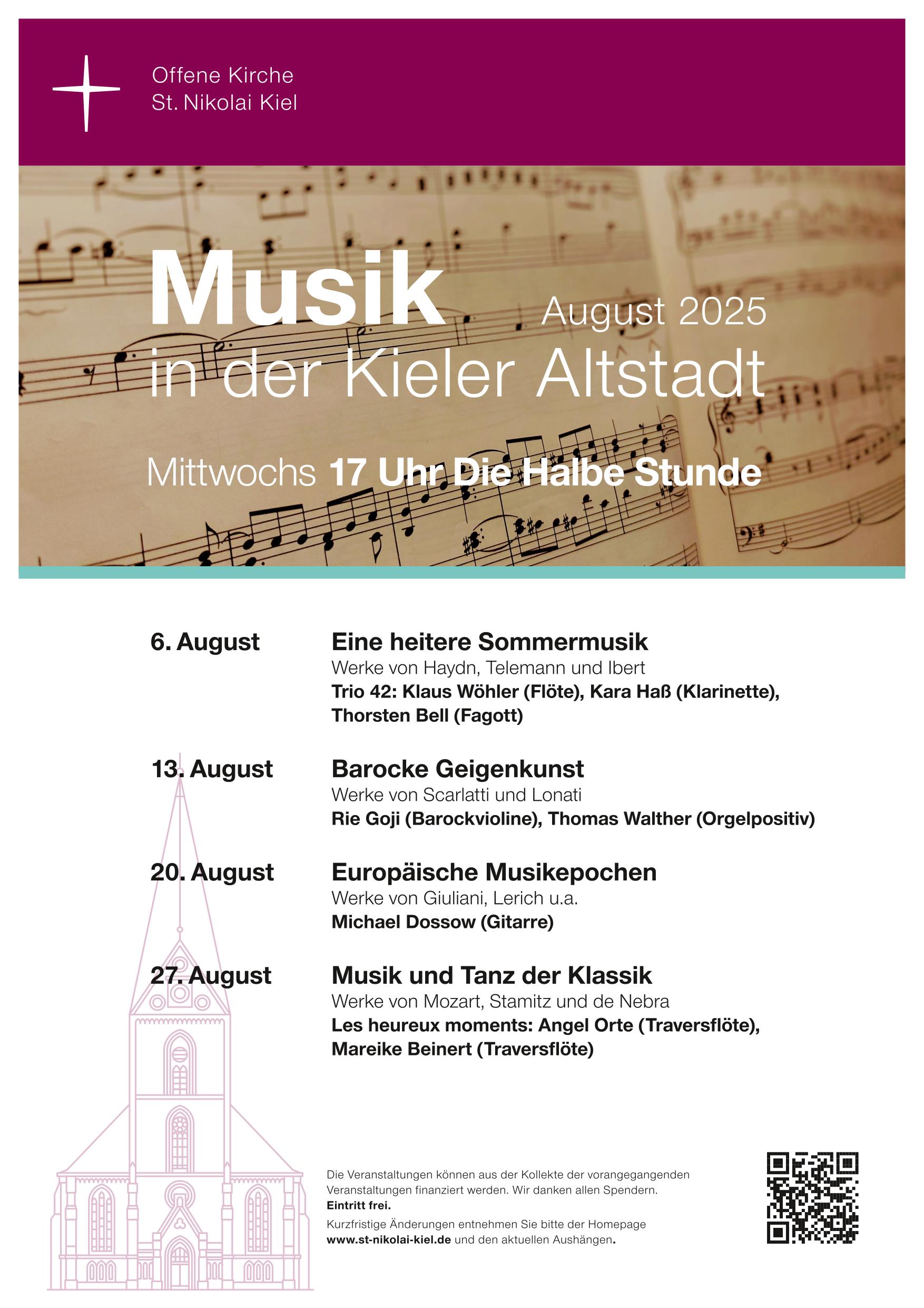 DIE HALBE STUNDE konnte nun erstmals stattfinden. Der Erfolg stellte sich gleich zu Beginn dieser Reihe ein. Offensichtlich war diese Veranstaltungsreihe eine Marktlücke. Eine halbe Stunde Musik zur Entspannung von einem turbulenten Geschäftstag, Mittwoch nachmittags um fünf Uhr bei freiem Eintritt, das hat es in Kiel bis dato nicht gegeben. Unglaublich viele Leute unterschiedlichster Altersklassen und Berufe nutzen das Angebot der St. Nikolai-Gemeinde. Das Angebot reicht von klassischer Musik aller Epochen bis hin zu Jazz-Improvisationen. Jedes Mal musizieren andere Künstler, vom Chor bis zu solistischen Besetzungen. Orgelmusik und Instrumentalmusik unterschiedlichster Art beleben die Vielfalt dieser Konzertreihe.