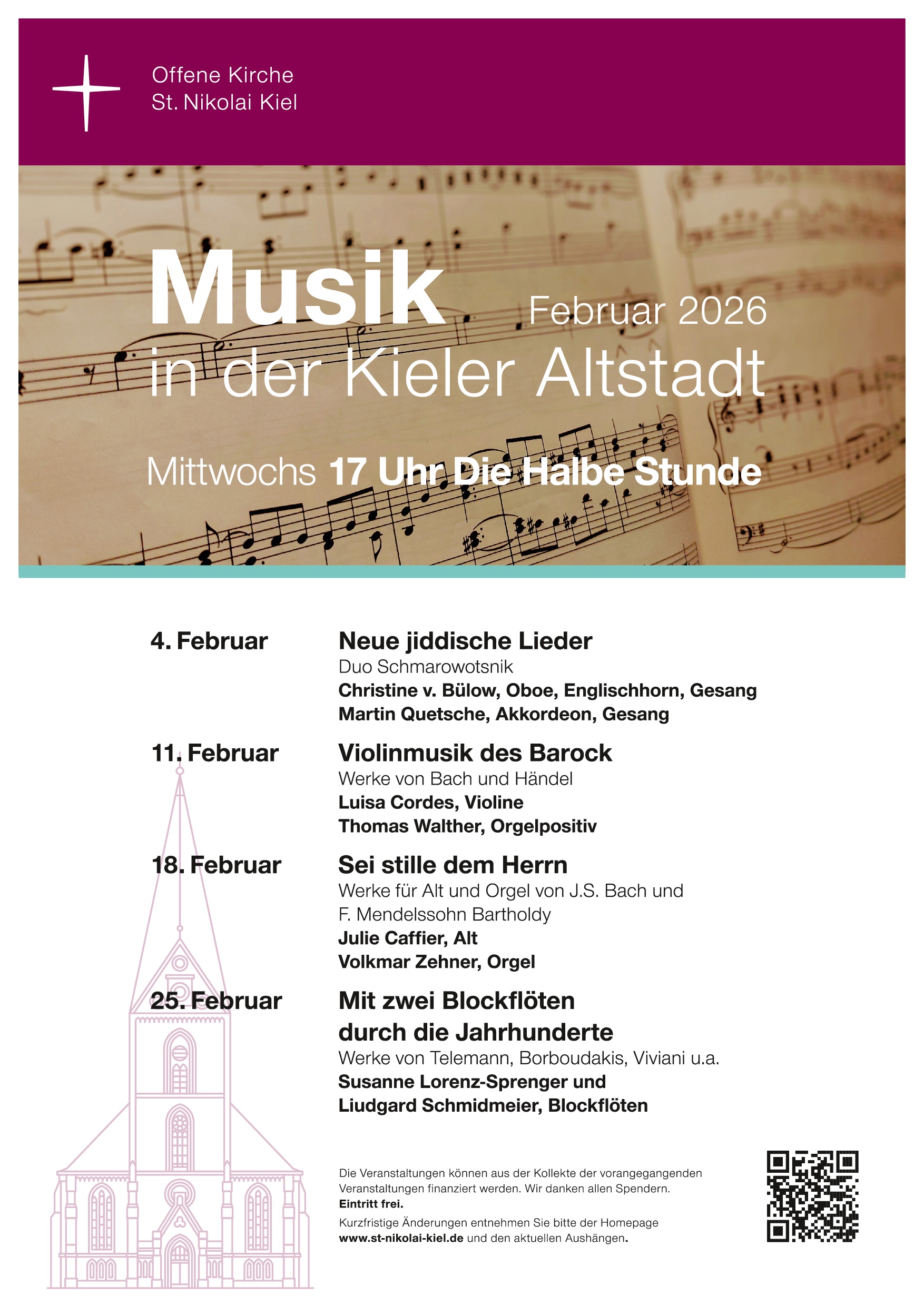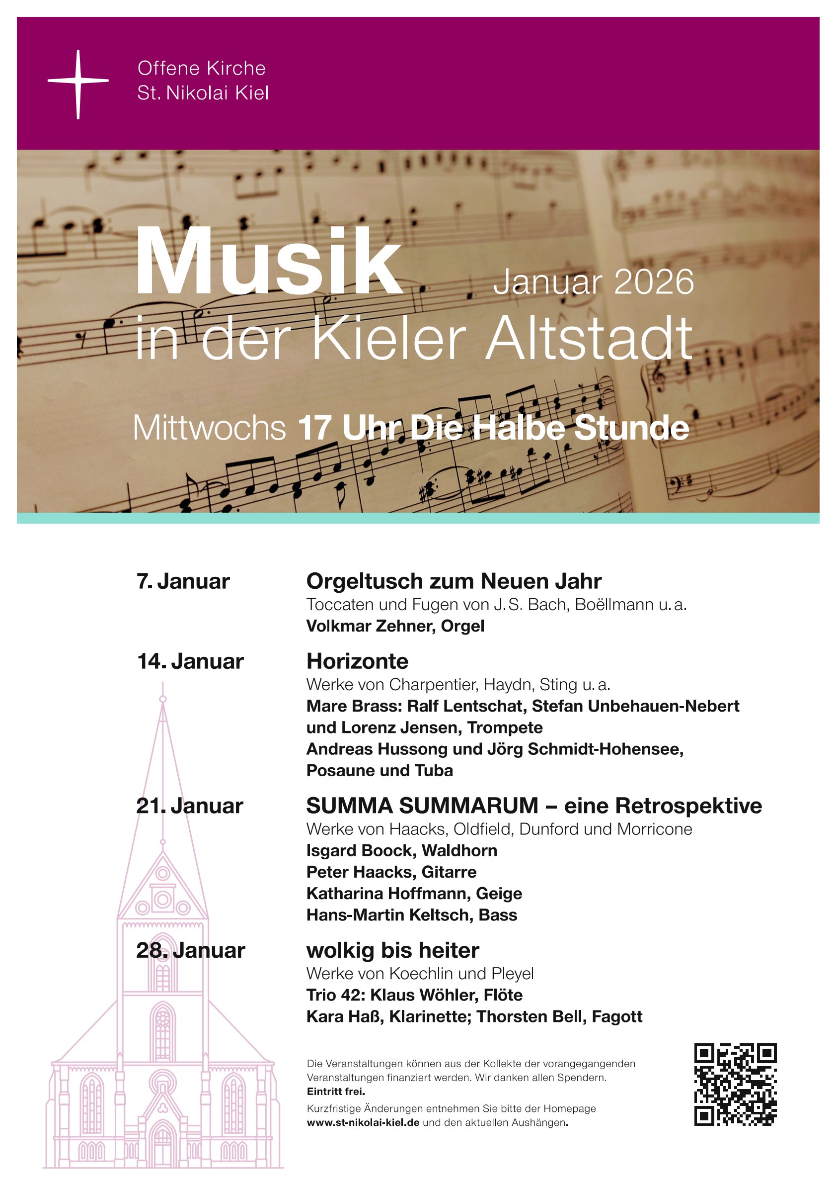 DIE HALBE STUNDE konnte nun erstmals stattfinden. Der Erfolg stellte sich gleich zu Beginn dieser Reihe ein. Offensichtlich war diese Veranstaltungsreihe eine Marktlücke. Eine halbe Stunde Musik zur Entspannung von einem turbulenten Geschäftstag, Mittwoch nachmittags um fünf Uhr bei freiem Eintritt, das hat es in Kiel bis dato nicht gegeben. Unglaublich viele Leute unterschiedlichster Altersklassen und Berufe nutzen das Angebot der St. Nikolai-Gemeinde. Das Angebot reicht von klassischer Musik aller Epochen bis hin zu Jazz-Improvisationen. Jedes Mal musizieren andere Künstler, vom Chor bis zu solistischen Besetzungen. Orgelmusik und Instrumentalmusik unterschiedlichster Art beleben die Vielfalt dieser Konzertreihe.